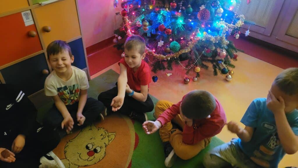 Podczas warsztatów uczniowie rozpoznawali świąteczne aromaty: cynamonu, suszonego jabłka, suszonych pomarańczy, grzybów oraz wanilii. Wąchali pierniki, próbowali rozpoznać zapach imbiru i goździków, a także oglądali łodyżki sosny. Było to niezwykle ciekawe i angażujące doświadczenie sensoryczne, które sprawiło dzieciom wiele radości.